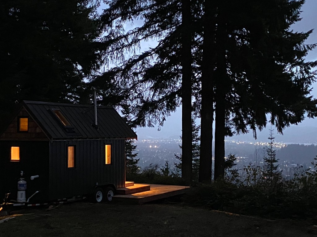 The Huckleberry Hut is a hand-crafted tiny house tucked into the fir trees at Camp Stingeroo, perched above the Columbia River on thirty acres of meadow and forest. It was built for the person who needs to get away from the noise and back inside their own head.